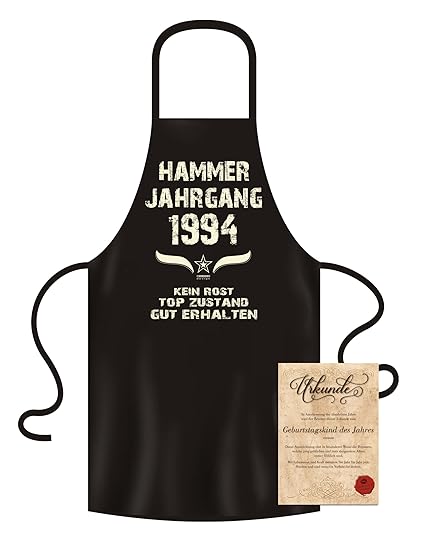 Premium Qualität! Grill- Kochschürze aus 100% Baumwolle dazu erhalten Sie unsere lamminierte (Fotoqualität) Urkunde für das Geburtstagskind des Jahres! Bedruckt werden unsere Schürzen mit G.O.T.S. Zertifizierter Siebdruckfarbe. Die Grillschürze hat eine Länge von ca. 100cm lang und 70cm breite. Ausgestattet ist die Schürze mit 2 langen seitlichen Bändern zum bequemen Umbinden und einer großen Kopfschlaufe. Die Umhängeschürze ist Hitzebeständig und schützt Sie hervorragend vor Fettspritzer. Unsere Schürzen sind komplett doppelt verhäht, also sehr Robust und Zeitgleich ist sie Zeitlos vom Design. Unsere Schürze ist nach dem Öko Tex 100 Standard hergestellt worden - bei den Materialien wird auf Polyester gänzlich verzichtet. Sie können unsere Schürzen bei 40°C mühelos waschen. Der Druck ist sehr Farbecht und auch langlebieg. Sie werden viel Freude mit diesem wunderschönen Geschekeartikel bereiten.