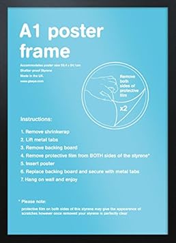 FRONT: Aufgrund der Größe hat der Bilderrahmen A1 eine Scheibe aus bruchsicherem Plexiglas. Um Kratzer zu vermeiden sind beide Seiten mit einem Schutzfilm versehen. Bitte entfernen Sie diesen von BEIDEN Seiten.