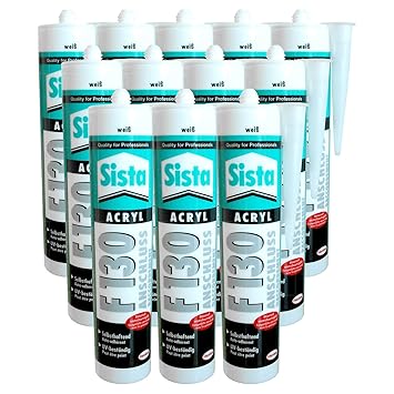 6er Sparpack Überstreichbarer, einkomponentiger Acryl-Dichtstoff in weiß für Innen und Außen Überstreichbar mit den meisten handelsüblichen Anstrichsystemen - Gute Haftungseigenschaften auf den meisten bauüblichen Untergründen Haftet auch auf feuchten, saugenden Untergründen ohne Primer - Leicht ausspritzbar Anwendung: Sista Acryl F130 ist für gering belastete Anschlussfugen im Innen und Außenbereich, wie z. B. kleine und mittlere Holzfenster, Rollladenkästen und Fensterbänke bestens geeignet. › Weitere Produktdetails