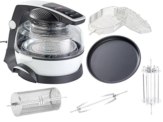 10-in-1-Halogen-Konvektionsofen/ Multi-Kocher/ Heissluft-Multi-Fritteuse für KÖSTLICHES, VIELSEITIGES, GESUNDES Essen in KÜRZESTER ZEIT Fettfrei Frittieren | Kochen | Grillen | Braten | Backen | Schmoren | Garen | Rösten | Dämpfen | Warmhalten, Erhitzen & Auftauen – Ersetzt Backofen, Fritteuse, Mikrowelle, Reiskocher & mehr! Digitales Funktionsdisplay | Präzise Temperaturwahl von 60° bis 250° | Präzise Zeitwahl von 1 Minute bis 3 Stunden | VOREINGESTELLTE Menü-Programme | ZEIT-VORWAHL (10 Minuten bis 19,5 Stunden) | AUFTAU- und WARMHALTE-FUNKTION 12 LITER-Behälter aus HITZE-BESTÄNDIGEM GLAS | Der mitgelieferte EXTENDER-RING erweitert das Fassungsvermögen auf 17 LITER | Die mitgelieferten 2 Gitterroste (1 x flach/ 1 x hoch) ermöglichen die zeitgleiche Zubereitung mehrerer Gerichte (z.B. Hauptspeise und Beilagen) oder größerer Portionen | Dank der Turbo-Vorheiz-Zeit lohnt sich der Halogen-Heißluft-Multi-Cooker auch für Singles Hinweis: Tauchen Sie den Deckel niemals in Wasser oder andere Flüssigkeiten. › Weitere Produktdetails