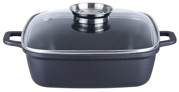 Spaß in der Küche durch die schnelle und einfache Zubereitung von leckeren Gerichten: Eckpfanne zum Anbraten, Garen und Schmoren von Fleisch - Geeignet für Gas, Glaskeramik, E- und Induktionsherd Verfeinern des Bratguts durch Aromaknopf: Langsames Abtropfen von Wein oder Brühe, Gesünderes Kochen: Nährstoffschonend, Reduzierte Nutzung von Öl und Bratfett durch Antihaftbeschichtung Frei von PFOA, 3-schichtig keramisch verstärkt: Hervorragende Antihaftwirkung, Hohe Kratzbeständigkeit, Sehr gute Abriebbeständigkeit, Backofenfest bis 230 Grad ohne und 180 mit Deckel, Bequeme Handhabung durch hitzebeständigen Kunststoffgriff Energieeffizient durch gute Wärme-Aufnahme und -verteilung, Einfache Reinigung: Heißes Wasser, Weiches Tuch, Spülmaschinenfest Lieferumfang: 1x Kela Servierpfanne, Kerros, 11553, Aluguss 5mm, Fassungsvermögen: 6l, Antihaftbeschichtung, Maße: 28 x 28 cm