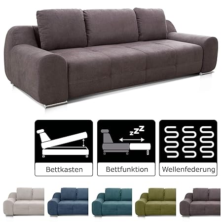 Sofa mit Schlaffunktion und Bettkasten Schlaffläche: 190x130 cm Inklusive Kissen-Set mit Reißverschluss Material: Microfaser + Baumwollstoff Die Polstermöbel werden von der Spedition ausgepackt und montiert
