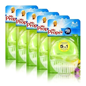 Halten sie Ihre Toilette sauber mit dem Mr. Proper 5 in 1: Frische, Duft, Anti-Kalk-Wirkung, Glanz und Sauberkeit mit jeder Spülung.