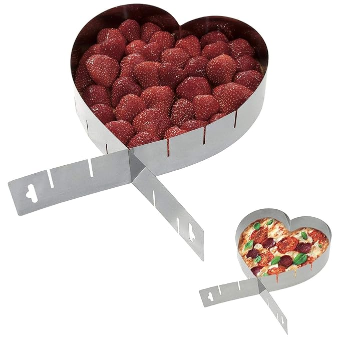 Perfekte Backform zum Backen einer Hochzeitstorte, aber auch für allerlei andere Anlässe geeignet, wie Valentinstag, Muttertag, Goldene Hochzeit, Silberne Hochzeit, oder um den Partner oder die Partner am Jahrestag zu überraschen. Der verstellbare Backrahmen ist aus Edelstahl und lässt sich leicht in die gewünschte Größe bringen. Super zum Backen von Biskuitboden. Mit dieser Herz-Backform können Sie beispielsweise einen einfachen Kuchen backen, den Sie wunderschön mit Erdbeeren garnieren können. Fortgeschrittene Hobbybäcker können auch mehrstöckige Torten mit unterschiedlich großen Herzen zaubern. Legen Sie los und überraschen Sie Ihre Liebste oder Ihren Liebsten mit einem selbergemachten Herz-Kuchen, der von Herzen kommt. Inhalt: Herzbackrahmen, verstellbar, von 29 -38 cm, aus Edelstahl