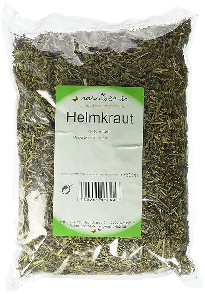 Zutaten: Pulver von Helmkraut (Scutellaria Hb.), ohne Zusatzstoffe. pflanzliche Kapselhülle. Tagesbedarf: 3 Kapseln Verzehrempfehlung: jeweils 1 Kapsel zu den Mahlzeiten auf nüchternen Magen. Für zusätzliche Informationen über die Wirkung können Sie sich durch verschiedene Fachliteraturen oder aus Internetquellen wie z.B. Videos, Heilkräuterseiten uvm. informieren, da wir aus rechtlichen Gründen keine Heilversprechen geben dürfen. Vielleicht können Sie dabei persönlich etwas Neues dazu lernen.
