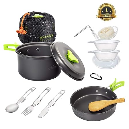 ?Kompakt Und Tragbar?Das Set verwendet eine verschachtelte Bauweise, Um Platz zu sparen und um es einfach zu transportieren. Der ganze Satz ist nicht größer als 6 Zoll und so ist es leicht in Ihrem Rucksack aufzubewahren. ?Leicht Zu Reinigen?Bratpfanne, Kochtopf und Teekanne sind aus sicherem und ungiftigem eloxierten Aluminium; Leicht, beständig und abnutzungsfrei; Antihaftbeschichtung für einfache Reinigung und aufzubewahren. Er heizt schnell auf und ist der perfekte Begleiter auf Ihrer Reise in die Natur. ?Hitzebestandige Griffe?Thermisch isolierte Plastikgriffe schützen die Hände vor Hitze; Anti-Rutsch-Design bietet einen festen und angenehmen Griff der Hände.Ideal für Camping, Picknick und Wandern. ?Hochwertiges Zubehor ?BPA-freien, Zwei Schüsseln und eine Servierkelle aus sicherem und ungiftigem PP-Plastik; Zudem ist ein umweltfreundlicher Reislöffel aus Bambus enthalten! ?11-Teiliges Set Enthält ?2 x Bratpfanne, 2 x Kochtopf, 1 x Bambuslöffel, 1 x Reinigungsschwamm, 3 x Schüsseln, 1 x Servierkelle, 1 x Aufbewahrungstasche.
