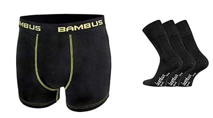 BOXERSHORT u. SOCKEN: Lässige Unterwäsche mit persönlicher Note für den modebewussten Herrn im jugendlichen Stil, die passgenau anliegt.ELASTIKBUND und Komfortbündchen: Ein hoher Elastikbund bei den Boxern liegt wegen der breiten Auflagefläche bequem an, schneidet nicht ein und stellt einen eleganten und formschönen Abschluss her. FLACHE NAHTE: Eine äußerst sorgfältig und flach gearbeitete Naht ist kaum spürbar und garantiert einen hohen Tragekomfort ohne Druckstellen zu verursachen. In bester Qualität und hochwertiger Verarbeitung so wie Mann es wünscht. Robust, strapazierfähig, praktisch und alltagstauglich. Boxershorts = 93% Viskose aus Bambuszellstoff, 7% Elasthan, Socken = 75% Viskose, 22% Polyamid, 3% Elasthan Pflegehinweis: 30 Grad Maschinenwäsche OHNE SCHADSTOFFE: Dieses Kombiset wird nach Oeko-Tex Standard 100 produziert. 40 - TAGE TESTEN: Sie können diese Shorts 40 Tage testen und bei Nichtgefallen einfach zurückschicken. ANTI-LOCH-GARANTIE: Wir geben auf diese Unterhosen eine siebenmonatige Anti-Loch-Garantie. Bei einem Loch in diesen Shorts können Sie uns jederzeit kontaktieren und Sie erhalten umgehend eine Ersatz-Lieferung.