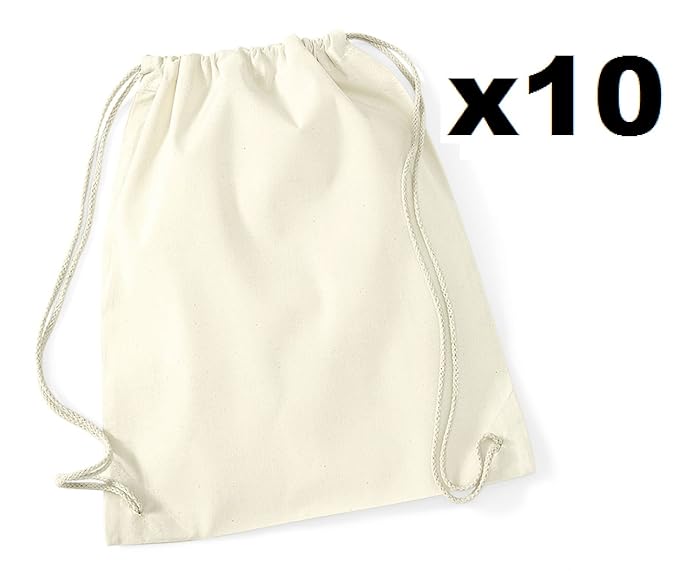 available as x1, x5 and x10pcs 100% baumwolle 140gsm Drawstring carry handles on each side 12 litres capacity