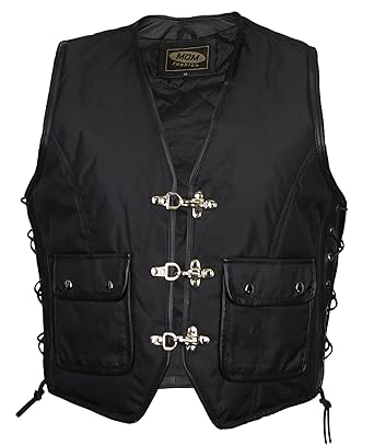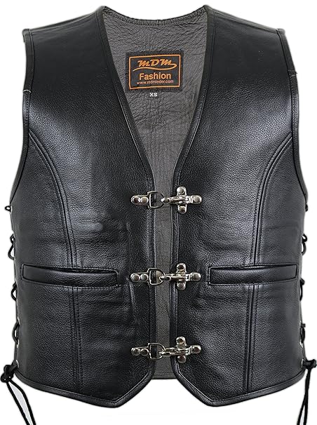 Drei Metallverschlüsse, Schnallenverschluss, beiderseitig Seitenschnur zwei Außen Taschen, zwei tiefe Innentaschen, eine hiervon mit Reißverschluss Leder (Rind) Lederweste Pflegehinweis: mit Leder Balsam können sie das Leder pflegen und gleichzeitig auch schützen Modellnummer: MDM917 Keine Mittelrückennaht, auch Ideal für Club-Logos und / oder Patches geeignet