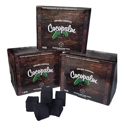 eine Packung COCOPALM Natural Charcoal enthält 64 Würfel, Würfelgröße 26cm x 26cm x 26 mm Bis zu 100 Minuten Brenndauer, geringe Rauchentwicklung, kein Eigengeschmack Keine chemischen Zusätze - damit wesentlich gesünder als selbstzündende Kohle BBQ: Auch für gesundes Grillen geeignet - sehr beliebt bei Profi-Grillern hochwertige Shisha Naturkohle aus 100% Kokosnussschale, produziert unter streng kontrollierten Auflagen in Indonesien