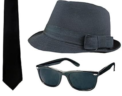 Foxxeo 3 Teile Brothers of Blues Kostüm Set Filz Hut Weyfarer Sonnenbrille Krawatte
