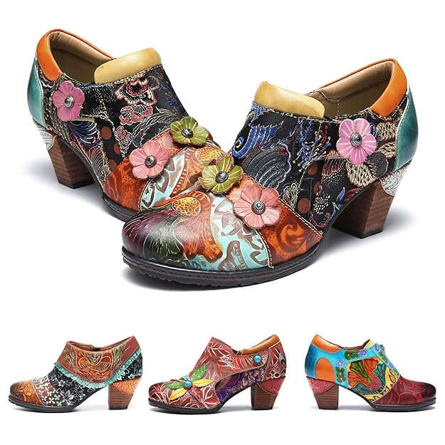 crazycatz Damen Stiefeletten mit Absatz Leder Chelsea Kurze Stiefel Handgefertigte Gestickt Bunte Patchwork Gestickte Blumen