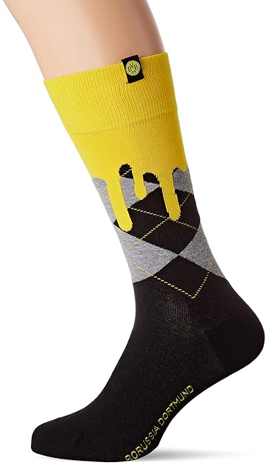 Argylemuster mit Farbtropfen-Effekt im BVB-Look Gekämmte Baumwolle 92% Baumwolle, 6% Polyamid, 2% Elasthan BVB Pflegehinweis: Maschinenwäsche 40°C Modellnummer: 20489 BVB Branding an Rand und Sohle
