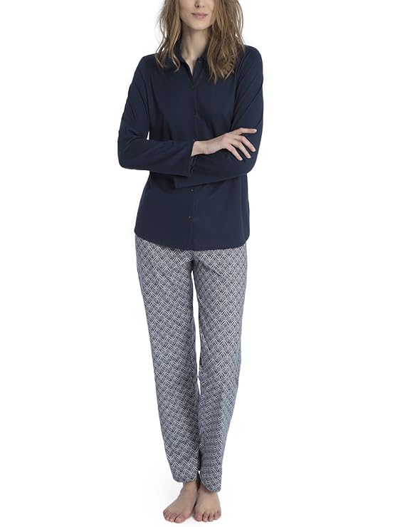 Pyjama für Damen, Modern Fit aus 100% Baumwolle 100% Baumwolle Pflegehinweis: Maschinenwäsche warm (40° +) Modellnummer: 43026 in Interlock-Qualität unifarbenes Oberteil mit langem Arm und Knopfleiste gemusterte Hose mit Bündchen