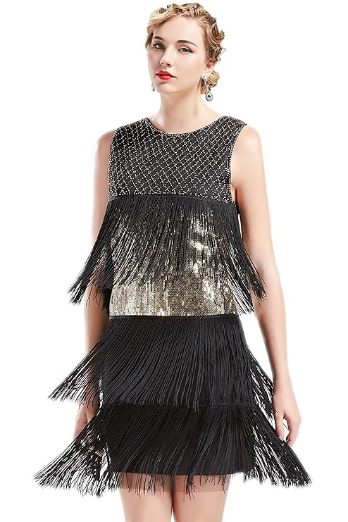 BABEYOND Damen Kleid Retro 1920er Stil Flapper Kleider mit Zwei Schichten Troddel V Ausschnitt Great Gatsby Motto Party Kleid