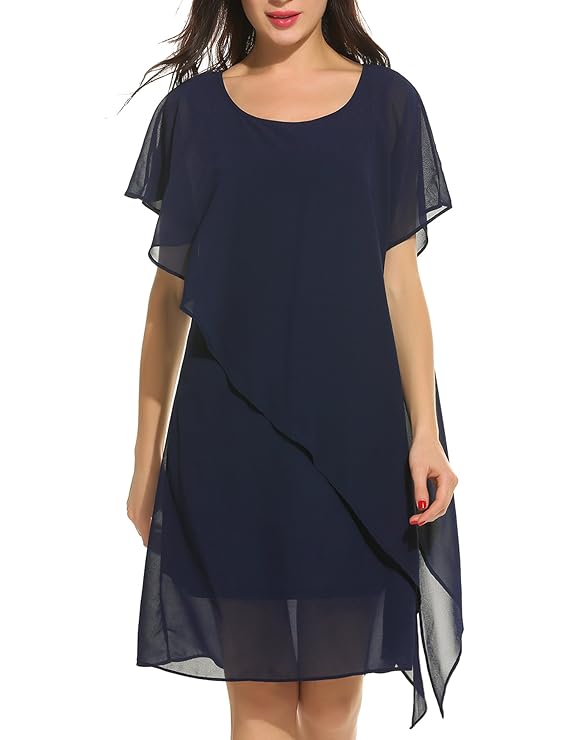 ECOWISH Damen Chiffon Kleider Asymmetrisch Sommerkleid Einfarbig Rundhals Kurzarm Plissee Kleid Casual Lose Kleid Knielang