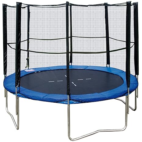 Trampolin Set bestehend aus Sprungmatte, Federn, gepolsterter Randabdeckung und Netzstangen, Sicherheitsnetz und Einstiegsleiter Fitness- und Spielgerät für Groß und Klein: Trampolinspringen macht nicht nur Spaß, sondern fördert auch Ihre Motorik und Körperbeherrschung, stärkt Ihre Muskeln und Gelenke und hilft beim Stressabbau Die Sprungmatte und die Randabdeckung sind aus langlebigen und UV-beständigen Polypropylen Unsere Trampoline wurden von der akkreditierten deuschen Prüfstelle Intertek mit dem Prüfsiegel 'GS' (geprüfte Sicherheit) versehen Erhältlich in verschiedenen Größen