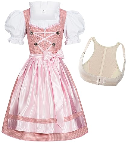 Gaudi-Leathers Dirndl Set 4tlg. Trachtenkleid Joy rosa weiß kariert, Dirndlbluse, Schürze grün + Push Up Büstenhebe BH, Marke
