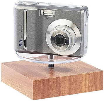 Aufsehen erregende Magnet-Schwebebasis in edler Holz-Optik • Objekte drehen sich freischwebend • Maße: Basis 17,5 x 17,5 x 4,5 cm, Schwebeteller Ø 6 cm