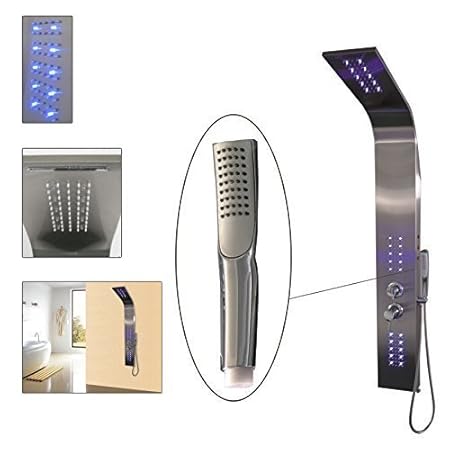 ?Standard 1/2 Zoll, alle Ersatzteil wird innerhalb 5 Jahre kostenlos umgetauscht werden. ?5 Massagedüsen SPA: 130cm Große, 8 Blaue Leds, gemütliches Atmosphäre lassen Sie total entspannen nach den ganzen Tag Arbeit ?Deutliche Maße sehen Sie im dritte Bild? ?Aktuelle Wasser Temperatur Display: Mit 95*60mm Große Anzeige schutzen Sie und Ihre Familie von der Angenehmsten Temperatur des Wasser zu genießen ?Material Zuverlässig und Dauerhaft: Der Hauptköper von dem Duschpaneel besteht aus Kuper,gebürstet Edelstahl Abdeckung, längere Lebensdauer und einfach zu reinigen ?Einfach Montage: Mit Kurzanleitung ist es Kinderleicht . Achtung: Das Duschpaneel ist nicht geeignet für Eckmontage und Thermostat. › Weitere Produktdetails