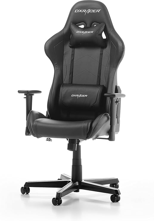DXRacer RACING SERIES RO-NE Gamingstuhl, ergonomisch konzipiert ähnlich der Formula Serie, jedoch mit einer höheren Rückenlehne Stufenlos höhenverstellbar (empfohlene Körpergröße 165-195cm), Rückenlehne von 90° bis 135° verstellbar, mit Wipp- und Feststellfunktion 3-D verstellbare Armlehnen, inklusive Kissen für Kopf- und unteren Rückenbereich, Sitzhöhe 41-51cm, 8+ Stunden Sitzkomfort beim Gamen oder im Office Extrem stabiler und verstärkter Stahlrohrrahmen und Aluminiumdrehkreuz, entwickelt aus der Rennsporttechnik, belastbar bis 100kg Einfache Montage mit mitgelieferter Montaganleitung