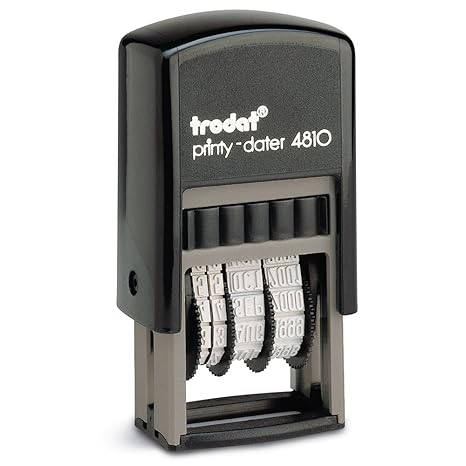 Kleiner selbstfärber Datumsstempel – verstellbares Datum mit Ziffern und Text für 12 Jahre Helles und damit gut leserliches Ziffern- und Textband; über leichtgängige Rädchen verstellbar Das integrierte schwarze Stempelkissen trocknet nicht aus und kann einfach und sauber ausgetauscht werden – Ersatzkissen 6/4911 Stempelfarbe dokumentenecht nach DIN14145-2 Trodat Stempel mit nachhaltigem Eco Umweltkonzept – umweltfreundlich und CO2 neutral, als Standard › Weitere Produktdetails