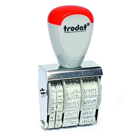 Klassischer Trodat Handstempel mit ergonomischem Griff Gehäusefarbe: Grau-Rot Metallrahmen Gleichmäßige, saubere Abdrucke Datumstellung: ISO