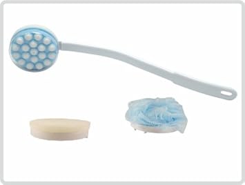 Eincremhilfe mit Massageroller, Badeschwamm und Badeblume 3 versch. Aufsätze eincremen und massieren ohne fremde Hilfe für verschiedene Plfegemittel geeignet Farbe: hellblau