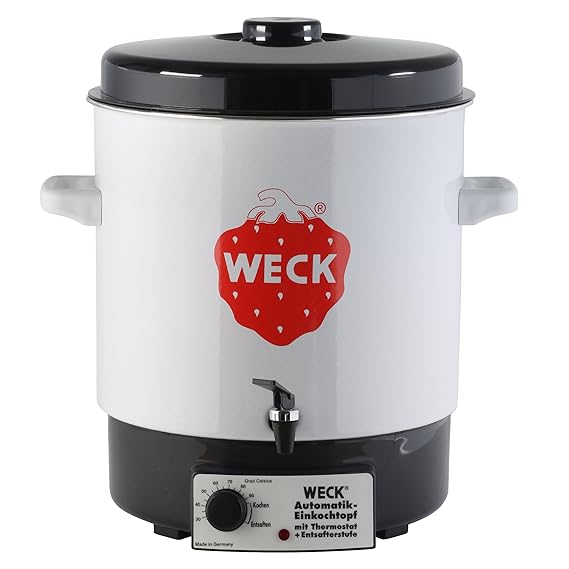 WECK Einkochautomat, Einweckautomat mit 2-fach Emaillierung zur hervorragenden Wärmeisolierung, Präzisionsthermostat, geschlossener Topfboden Einkochautomat aus 2 Schicht Emallierung, geschlossener Topfboden, macht das zubereiten von Speisen möglich, bedienerfreundliche Temperatursteuerung durch Präzisionsthermostat, ermöglicht Kochen und Warmhalten, konstante Temperaturen mit Hilfe eines Regelthermostates erzielbar Einweckvollautomat mit Entsafterschaltung, 120 Minuten Zeitschaltuhr, Überhitzungsschutz und Kontrolleuchte Zum Einkochen von ca. 14 Gläsern á ca. 1 Liter, Gesamtfassungsvermögen 29 Liter, Einlegerost Lieferumfang: 1 x Einkochautomat, Ø 36 cm, Fassungsvermögen ca. 29 Liter, Einlegerost für ca- 14 Gläser á 1 Liter, Entsafterschaltung, Überhitzungsschutz, 120 Minuten Zeitschaltuhr, Präzisionsthermostat, 2000 Watt, geschlossener Topfboden, Kontrolleuchte
