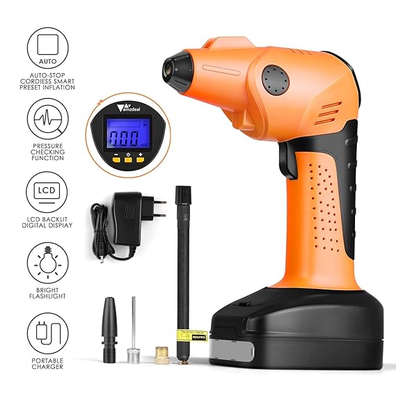 ?Vielfältige Verwendungszweck? Die tragbare Reifenpumpe ist nicht nur für Autos sondern auch für Fahrräder, Spielbälle, Schwimmring und sonstige aufblasbare Gegenstände geeignet. Die 2,000mAh Lithium Batterie kann auch als Power-Bank verwendet werden. Ihre Handy kann beim Notfall durch die Basis aufgeladen wird. ?Sicherheit?Vor dem Aufblasen können Sie mit dem Bildschirm einen Zieldruck voreinstellen. Wenn es den zuvoreingestellten Druck erreicht, schaltet sich der tragbare Luftkompressor automatisch ab, was sichere Handhabung gewährleistet. Sie können auch mit der Pumpe Ihren Reifendruck regemäßig überprüfen, was die Sicherheit Ihre Fahr gewährleistet. (Die Genauheit des Manometers ist +/- 0,5 PSI) ?Hervorgende Leistung? Die Aufblasgeschwindigkeit ist 30-60 L/ Min, viel Stärker und schneller als herkömmliche Pumpen (20-35 L/ Min). In ca. 15 Sekunde können die Luftpumpe einen Basketball aufpumpen, 45 Sekunde einen Motorradreifen. Und vergessen Sie bitte nicht, die Luftpumpe nach dem Gebrauch vollständig aufzuladen, damit können Sie die ohne -lästige- Kabele Autopumpe irgendwann und Irgendwo verwenden . ?LED Licht und großer LCD Bildschirm? Das Licht wird Ihnen beim Notfall in der Nacht zur Verfügung stehen und eine angenehme Nachtbeleuchtung bieten. Mit dem großen LCD Bildschirm können Sie deutlich die Fortschrittsanzeige und den Batterie Status sehen und auch die Einheiten (BAR/ KPA/ KG/CM2/ PSI) wählen. ?Amzdeal Garantie? Amzdeal bietet ab dem Kaufdatum eine 18-monatige Garantie. Haben Sie irgendwelche Probleme, kontaktieren Sie uns bitte sofort. Wir werden so schnell wie möglich die Probleme für Sie lösen.