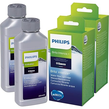Regelmäßiges Entkalken mit Saeco Entkalker garantiert eine lange Lebensdauer. Geeignet für alle Kaffeevollautomaten, Espressomaschinen, Filterkaffeemaschinen, Dampfreinigungsgeräte und Dampfbügelstationen Inhaltsstoffe Entkalker: Zitronensäure, Milchsäure, Korrosionsinhibitoren Saeco Intenza+ Wasserfilter von BRITA Water Technology: Wasserfilterkartusche für Saeco Espressoautomaten. Optimale Wasserhärte und optimaler pH-Wert für vollen Kaffeegenuss Passend für alle Modelle der Produktlinien Xelsis, Synthia, xmall, Primea, Talea, Odea, Incanto, Magic New Version, Royal New Version, Nina, Lavazza A Modo Mio, deren Wassertank mit einem BRITA-Aufkleber gekennzeichnet sind Ausführliche Gebrauchsanleitungen liegen bei