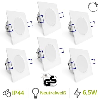 Die super flache Beleuchtung im praktischen 6er Set - Einbautiefe nur 29mm - IP44 für Innen & Außen geeignet Die Einbauspots mit 18 cm vorinstalliertem Kabel können Sie direkt an 230V ohne Trafo anschließen Durch die milchige Leuchten Front entsteht eine homogene Ausleuchtung mit zusätzlicher Dimmfunktion LED Leistung 6,5W bei 570 Lumen - Leuchtmittel fest verbaut - neutralweiß 4000 K - Abstrahlwinkel 110 Grad - GS geprüft Einbauloch Ø 68-75mm / Aussen Ø 85mm / Tiefe: 29mm / Kabel 18cm / Lieferumfang 1x Einbauleuchte dimmbar › Weitere Produktdetails