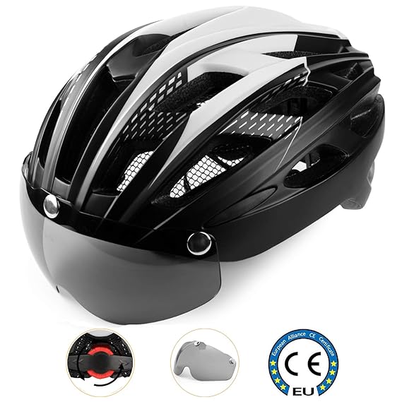 Ultraleicht für Komfort; Nur 0.49lb In-Mold Polycarbonat Schale mit EPS-Liner, Es ist sehr angenehm zu tragen Einstellbares Zifferblatt zum Anpassen der Passform; Passend für Kopfgrößen (M / L) 56-60cm, (L / XL) 59-63cm, Der Fahrradhelm mit 24-V-Kühlsystem hält Ample Ventilation für ultimative Temperaturregulierung und reduziert den Widerstand Tragbarer Helm Rucksack und Visier; kommt mit Visor und tragbarer Helmtasche Geschützt vor Sonne, Wetter, Staub und Anti-Aging, während die tragbare Helmtasche bequem ist, um Ihren Helm zu tragen Einfach und bequem, um den Fahrradhelm zu verwenden: Justierbares Vorwahlknopf, zum des Sitzes und der schnell abnehmbaren Zwischenlage und des Visiers besonders anzufertigen - einfach entfernbarer Zwischenlage ist bequem für Reinigung. Qualitätssicherung, wir bieten 12 Monate Ersatzservice