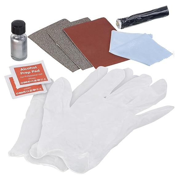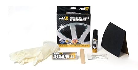 Schnelle Reparatur in 30 Minuten • Beseitigt Kratzer, Schrammen, Kerben u.v.m. • Erspart teure Werkstattbesuche • Profi-Qualität: sorgt für dauerhaften Halt • Hart im Nehmen: Vibrations- und Waschstraßen-beständig Ideal für Alufelgen und viele andere Aluminium-Produkte: zum Ausbessern und für Schutz vor Abnutzung und Witterung • Profi-Qualität: sorgt für dauerhaften Halt der Reparaturen • Gesamt-Gewicht: 75 g Schnelle Selbst-Reparatur in 30 Minuten: erspart teure Werkstattbesuche • Hart im Nehmen: Vibrations- und Waschstraßen-beständig Beseitigt Kratzer, Schrammen, Kerben und andere kleinere Schäden in Felgen und anderen Aluminium-Gegenständen • Set bestehend aus 12 Teilen: Füllmasse, Silberlack, 3x Schleifpapier, Reinigungstuch, 2 Alkohol-Reinigungs-Pads, 1 Paar Handschuh, 2 Spachtel Alufelgen-Reparatur-Kit inklusive deutscher Anleitung. Kfz-Reparatur-Set - Außerdem relevant oder passend zu: Auto Polier, Sandpapier, Lackstift, Polieren, Werkzeug