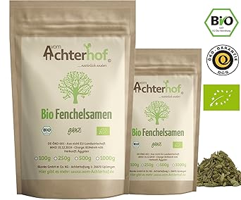 ? FENCHELSAMEN Die milden süßlich schmeckenden Fenchelsamen sind eine Investition in eine ausbalancierte Aromenküche. Die getrockneten Samen der Fenchelpflanze sind ideale Partner vieler intensiver Gewürze ? AROMA - Fenchel Samen nehmen intensiv würzigen Komponenten nicht die eigene Geschmacksnote, mildern deren Schärfe aber etwas ab. So tragen Fenchelsamen zu einer harmonischen Armonenbalance bei ? ANWENDUNG Sein hoher Anteil an ätherischen Ölen nutzt uns bis heute in Hustenbonbons oder Fencheltee Doch auch zum Backen kannst du Fenchelsamen kaufen. Ob im Lebkuchen oder Gewürzkuchen, die süßliche Note der Samen passt perfekt zu Süßem und frisch gebackenem Brot. Als festen Bestandteil der Mischung kannst du sie auch im Brotgewürz kaufen ? QUALITA?T – Unser Fenchel wird schonend und nachhaltig angebaut. Jeder Beutel wird per Hand in Deutschland abgefu?llt und unterliegt ständigen Kontrollen ? 100% NATURREIN - Selbstverständlich ohne Konservierungsstoffe, Aroma, Füllstoffe oder anderen Zusätzen › Weitere Produktdetails