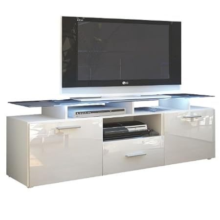 TV-Lowboard in weiß mit einer Hochglanz Front 4 Glaseinlegeböden mit LED-Beleuchtung, 4 Schubkästen und 6 offenen Fächern TV-Board: B/H/T ca. 179/66/44 cm. Im Lieferumfang enthalten ist ein TV-Lowboard Stabile Ausführung.