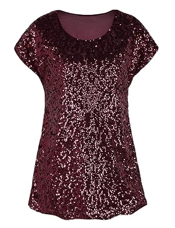 Front-Pailletten-Deko, Glitzer und glänzende Paillettenhemden Entspannte Passform, dehnbare, bequeme Party-Tops Rundhalsausschnitt, Dolman Sleeve / Cap Sleeve, bedeckt die Oberarme lange Hemdoberteile,lang genug und bedeckt auf der Hüfte;Einfaches und entzückendes Pailletten Top für jeden Anlass