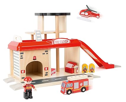 Das Set aus Holz und Kunststoff mit viel Zubehör wie Rutsche, Helikopter, Feuerwehrmann, Feuerlöscher und Einsatzwagen lässt action-begeisterte Kids viele spannende Abenteuer erleben.