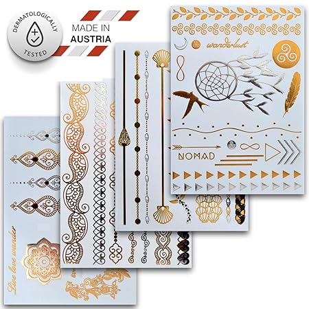 ÜBER 75+ neue & trendige Metallic-Tattoos. Freuen Sie sich auf lebendige Farben, genau wie auf den Bildern. DANK PREMIUM-Qualität funkeln und glitzern die temporären Flash-Tattoos mehrere Tage lang auf Ihrer Haut. Nicht zu vergessen, dass sie wasserfest sind. SICHER – Die stylischen Tattoo-Sticker sind ungiftig und für alle Altersgruppen geeignet. Sie können wortwörtlich von Kopf bis Fuß getragen werden. EINFACH & SCHNELL AUFKLEBEN – Setzen Sie Ihrem Look mit diesem heißen neuen Trend in weniger als 1 Minute das i-Tüpfelchen auf. Die stylischen Abziehtattoos lassen sich ganz einfach mit ein wenig Babyöl entfernen. Tragen Sie Ihren neuen Körperschmuck auf Armen, Beinen, Rücken, Schultern, Gesicht oder sogar den Haaren! SORGLOS-GARANTIE – Wir sind uns sicher, dass Sie von Ihren neuen Mode-Tattoos begeistert sein werden, weshalb wir Ihnen guten Gewissens eine 30-tägige Geld-zurück-Garantie anbieten können. Werfen Sie auch einen Blick auf unsere anderen Kollektionen und entdecken Sie weitere atemberaubende Designs.