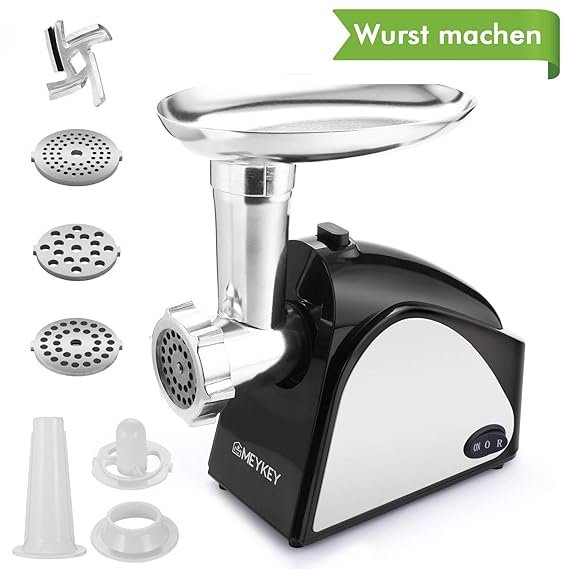 Geeignet für eine anspruchsvolle, völlig automatische Verarbeitung von Fleisch (auch gefrorenes), Fisch, Gemüse oder Obst in kürzester Zeit. Auswechselbare Schneidplatten. Fleischstücke können in 3 verschiedene Stärken zerkleinert werden. Fein, mittel oder grob. natürlich-zerkleinerten Scheiben zerkleinert werden Einfache Bedienung und automatischer Schutz. Innenschutzschalter zur Vermeidung von Motorüberhitzung. Rücklauffunktion und Sicherheitsschalter. Geringes Geräusch und gute Belüftung. 3 Schaltstufen, On-O-R, Position R drücken und der Schlitten dreht sich in die entgegengesetzte Position und der Innenraum leert sich. 3 Wurstaufsätze mit den Durchmessern 12mm, 17mm und 20mm | inklusive Kibbe-Aufsatz für gefüllte Hackbällchen Leistungsstarker elektrischer Fleischwolf 300W Fleisch Wolf elektrisch Meat grinder mit verschiedenen Aufsätzen und Edelstahl-Klingen