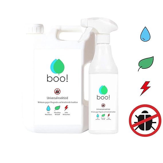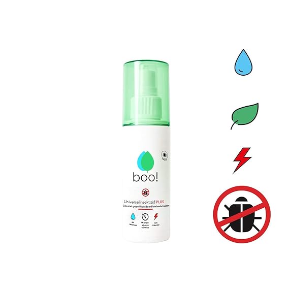 UNIVERSALINSEKTIZID: Das extra starke und universal einsetzbare Insektenspray boo! Plus wirkt hocheffektiv gegen Mücken, Zecken, Flöhe, Motten, Bettwanzen, Kakerlaken, Ameisen, Moskitos, Spinnen, Wanzen, Fliegen, Milben, Schaben, Staubläuse, Silberfische, Wespen, Speckkäfer, Brotkäfer, Maden, Kellerasseln und weiteres Ungeziefer sowie deren Larven