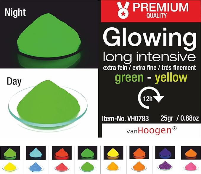 SICHER und LANGLEBIG: Unsere Farbpulver sind ungiftig und frei von gefährlichen Chemikalien. Nicht radioaktiv. Keine Abnutzung der Leuchtkraft. Leuchtstabil für zwanzig Jahre. Auch in Kinderspielzeug, Kunstharz oder Wandfarbe verarbeitbar.