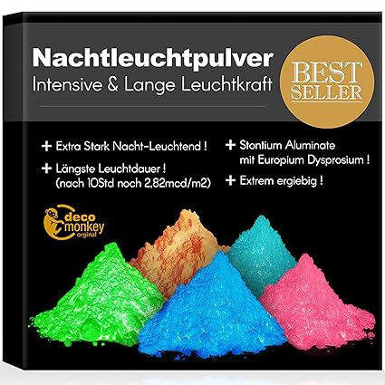 PROFI-MATERIAL: Wasserunlöslich. Verarbeitbar bis 1000 Grad Celcius. Die Nachtleuchtpulver sind in sämtliche Träger einarbeitbar wie Harz, Epoxidharz, Acryl, Resin, Lack, Kleister, Farbe oder Kleber. Wiederaufladbar, nachhaltig und regenerativ.