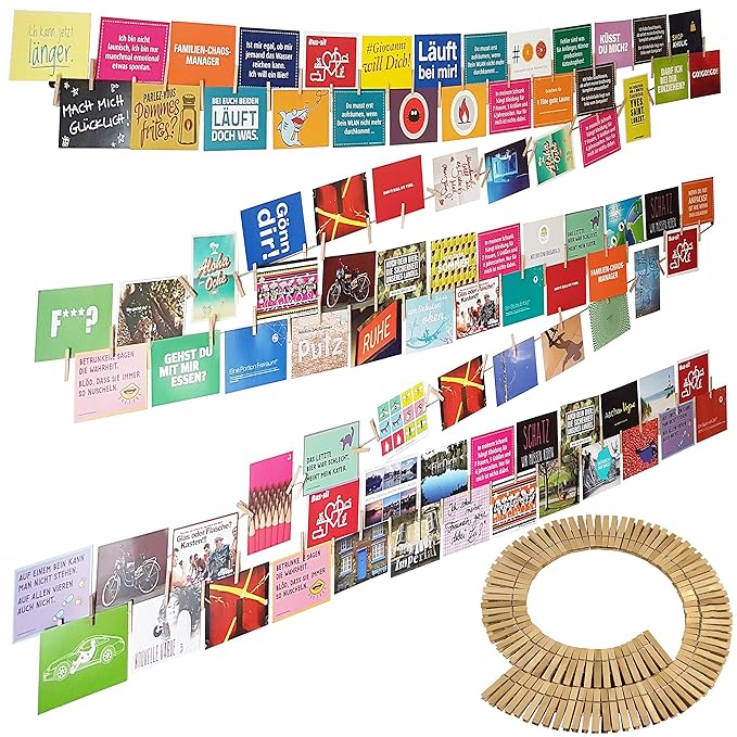 Einfach und vielfältig: Besteht aus 3 Holzleisten, 3 Wäscheleinen und 30 Holzklammern, zum Hängen und Zeigen mehrerer Karten, Notizen, Kinder-Kunstwerke oder Zeichnungen