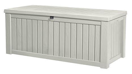 hergestellt aus wetterfestem Polypropylen (Kunststoff) Abmessungen :63,5 x 132,7 x 89,5 cm Volumen: ca. 227 Liter Belastbarkeit: ca. 272 kg ( Deckel ) Sowohl als Sitzbank als auch als Kissentruhe nutzbar Mit Verschlussmöglichkeit ( Schloss nicht enthalten ), Komplett wasserdicht, UV- sowie Witterungsbeständig