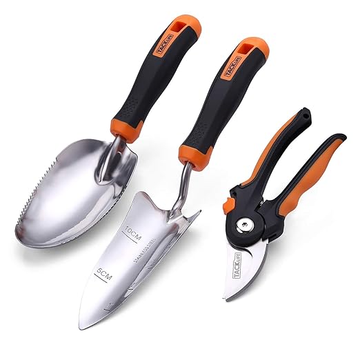 ? Erstklassiger Edelstahl: Aus rostfreiem Stahl, Dicke von etwa 1,5 mm, härter als die traditionelle Aluminiumlegierung auf dem Markt, nicht leicht zu biegen; Nicht einfach zu oxidieren, Korrosionsbeständigkeit ist gut und dauerhaft ? Mehrzweck: Enthalten Bypass-Gartenschere, Bodenschaufel,Transplantation Kelle, und sind sie größer und länger als Gewöhnliches, kann die Effizienz verbessern; Sie sind das perfekte Werkzeug für Balkone, Terrassen, Gemüsebeete und Vorgarten, und machen Ihre Gartenarbeit einfacher ? Bequemer Griff:: Der ergonomischer Griff ist durch eine Gummihülse geschützt; Der Griff ist groß ,und bietet hervorragenden Komfort, kann Handermüdung reduzieren ? Einfache Lagerung: Jeder Griff hat ein Loch an der Spitze, kann aufgehängt werden und einfach speichern; Die Farbe ist leuchtend Orange und können Sie es sofort im Garten finden ? Lieferumfang: 1x TACKLIFE GGT4A Gartengeräte Set: (1× Werkzeug Beutel,1× Gartenschere,1× Pflanzkelle, 1× Blumenkelle, 1× Harke, 1× Handschaufel mit Sägeblatt, 1× Unkrautstecher mit Winkel) +24 Monate Garantie. › Weitere Produktdetails