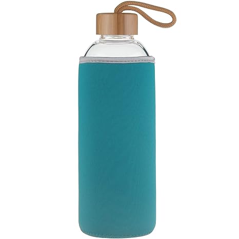 Sunkey Glasflasche 1 Liter Bpa Frei Trinkflasche Glas Doppelte Walled mit Hülle Neopren Edelstahl Deckel und Abnehmbarer Teef