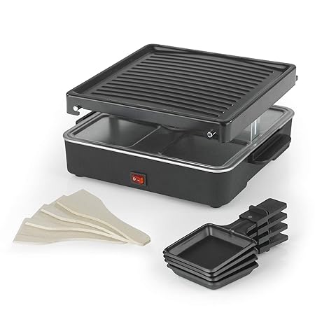 Raclette-Grill für bis zu 12 Personen mit 12 Anti-Haftbeschichteten Pfännchen | Fondue für bis zu 8 Personen mit 8 Fonduegabeln | Fonduetopf mit Glasdeckel zum sicheren Vorheizen und zur alternativen Nutzung
