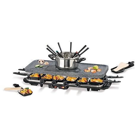 Raclette und Fondue Party-Grill Elektro Set für 4-6-8-12 Personen | Neue Version 2017 | Heisser Granit-Stein in der Mitte für