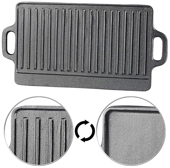 Big BBQ Grillplatte Gusseisen mit Griffen, 45 x 23 cm, Grill-Wendeplatte mit glatter und geriffelter Seite, voreingebrannt